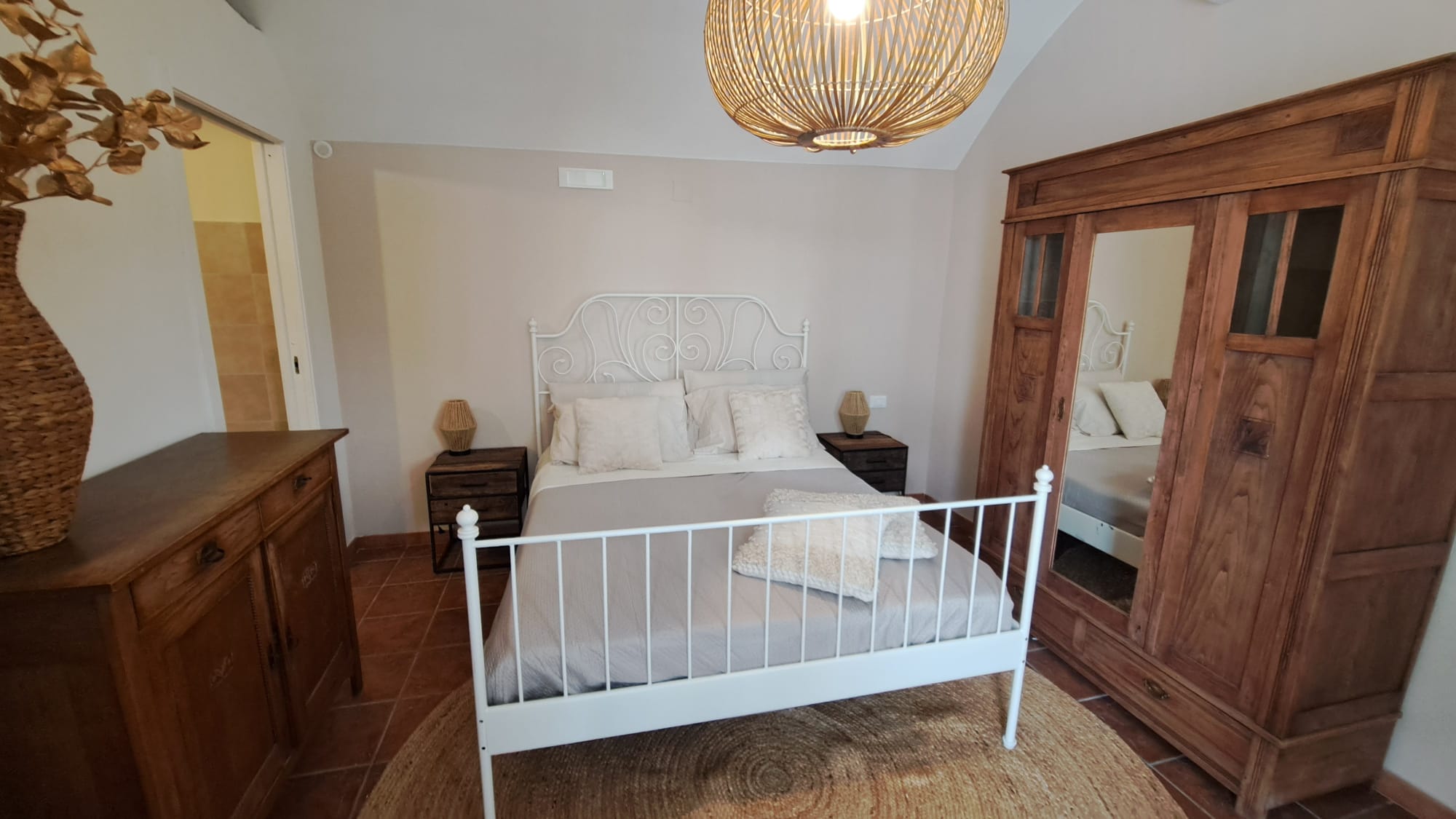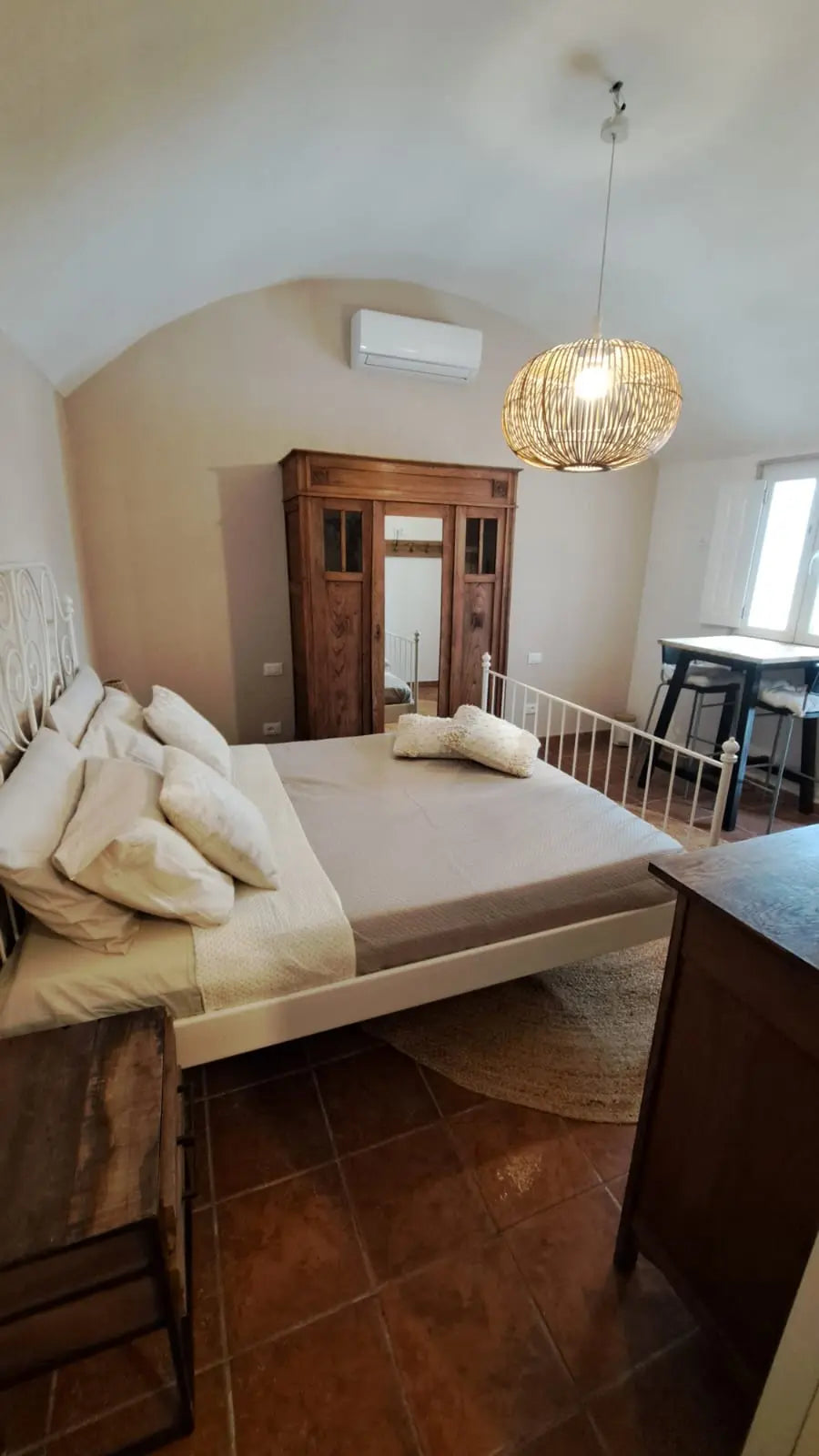 De slaapkamer is een oase van stilte, met dikke kalkstenen muren en een koel interieur. Het comfortabele tweepersoonsbed staat centraal in de ruimte, omringd door natuurlijke materialen, lichte stoffen en een vleugje landelijke elegantie. Hier word je wakker met het zachte licht van Puglia en niets dan het gezang van vogels.