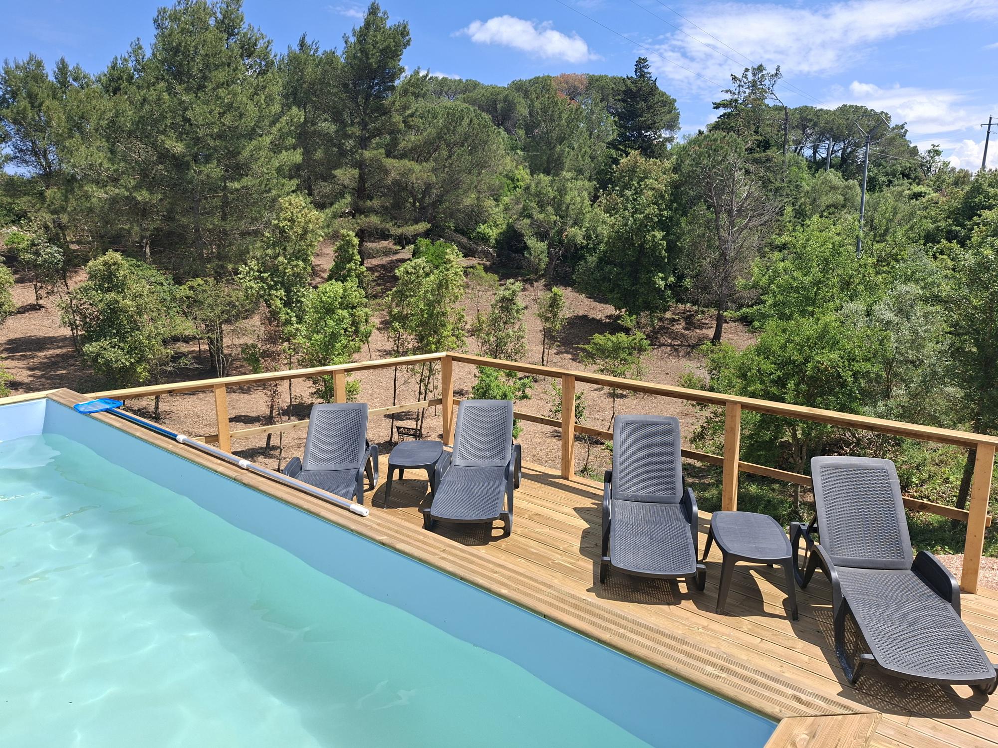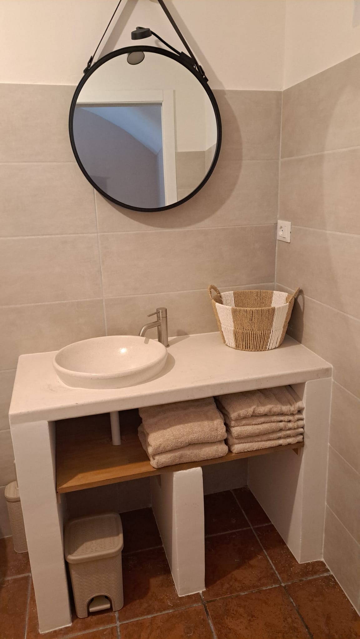 De badkamer is sfeervol, met betegeling in zachte mediterrane kleuren. Je vindt er een douche, toilet, wastafel en fohn. Praktisch en netjes, met een rustieke uitstraling die past bij het authentieke karakter van de lamia.