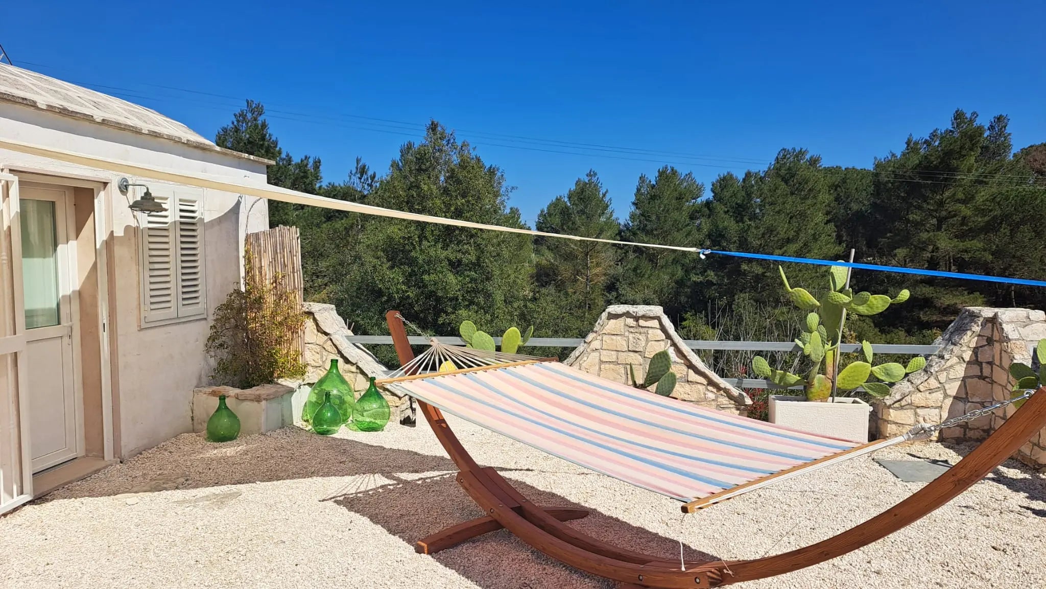 Lamia Asinello ligt midden in het betoverende landschap van Puglia, omringd door veel groen en een privebos. Buiten geniet je van de rust en de zon in een hangmat onder de bomen. Het terras ademt mediterrane eenvoud: witte muren, terracotta potten, en de geur van rozemarijn en lavendel. Ideaal voor lange, luie middagen en zwoele avonden onder de sterren.
